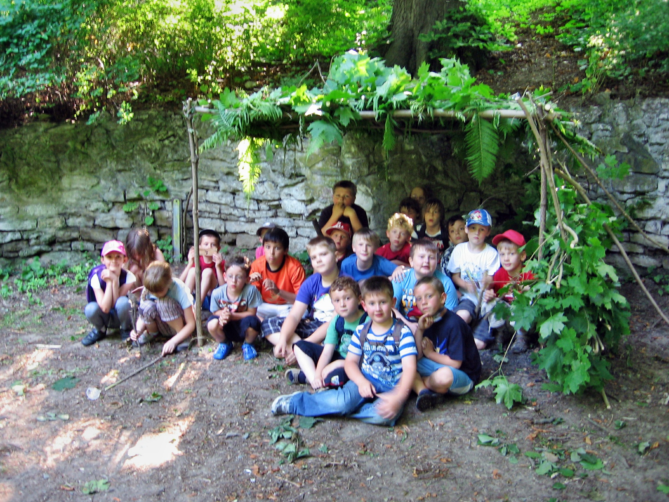 Steinzeithaus bauen und Feuer machen In der 2. Woche bauten die Kinder mit vereinten Kräften ein Steinzeithaus. Aus dicken Ästen