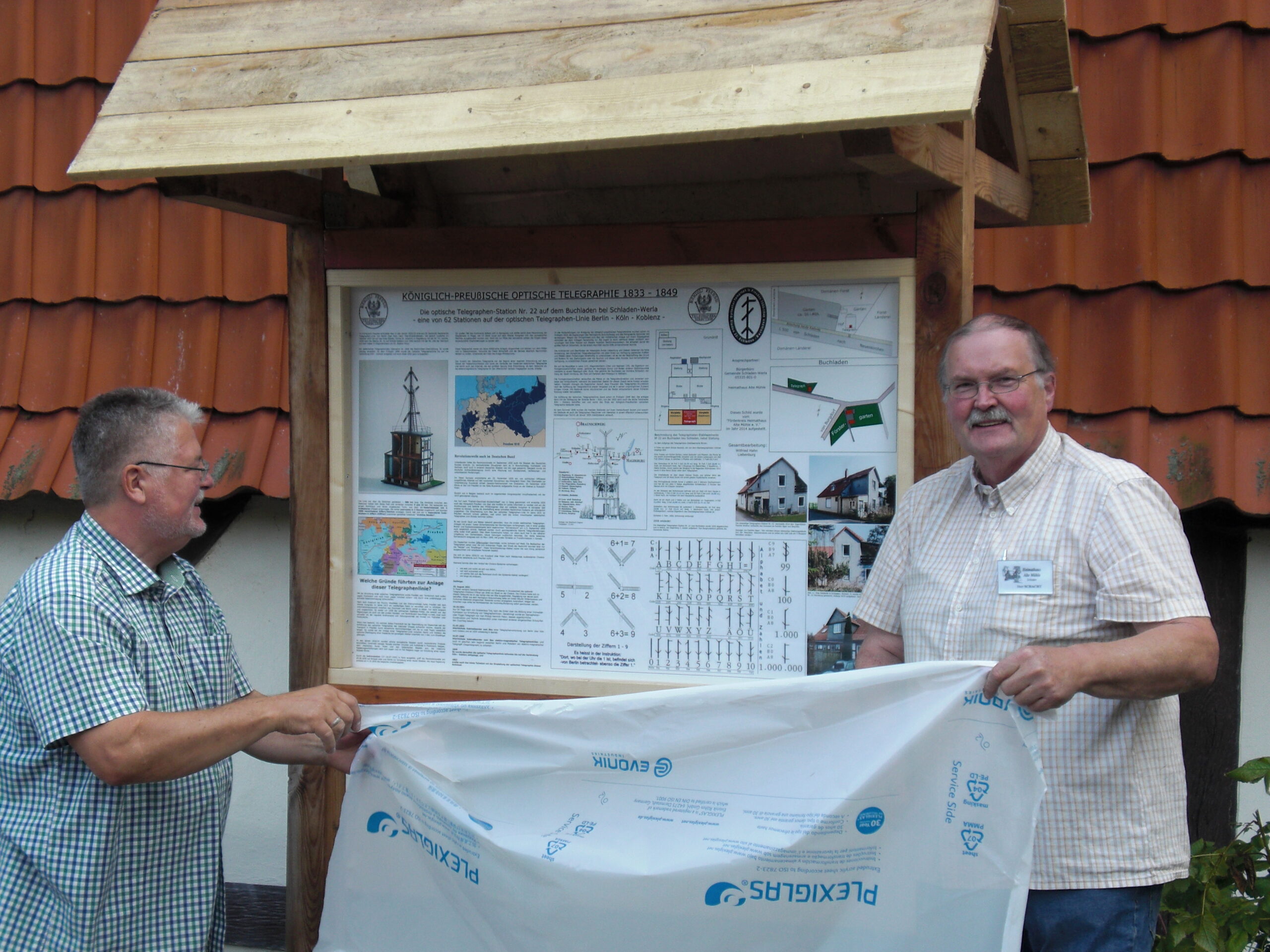Wilfried Hahn und Henning Schacht enthüllen den neuen Telegrapheninfostand am Heimathaus.